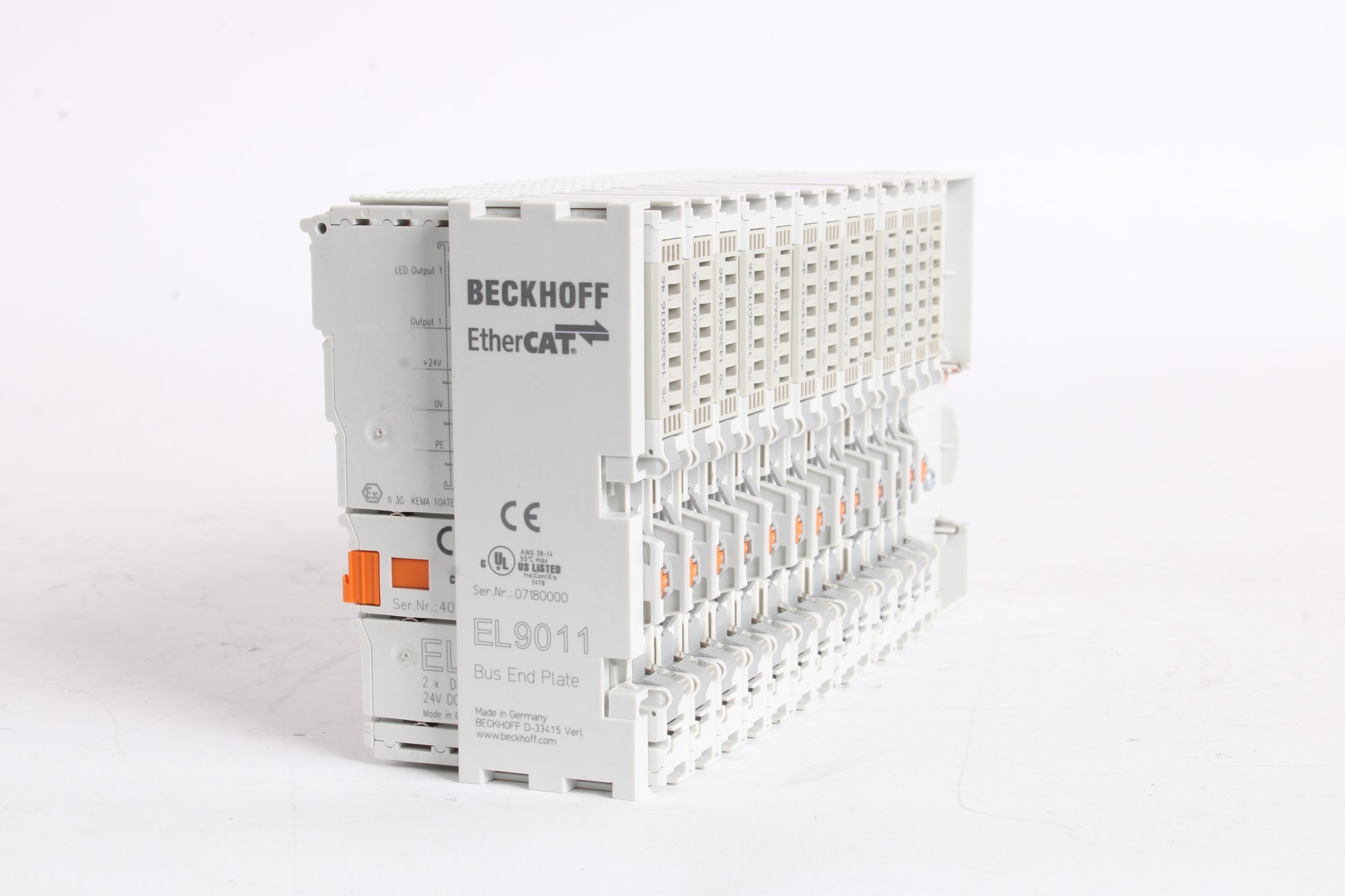 This EK1100 EtherCAT With EL3314, EL3681, 9x EL2262, EL9100, and EL9011 Bus End Plate has been removed from a fully operational system and is confirmed to be fully functional. It is in good overall physical condition, though please note it exhibits some scuffs and scratches from previous use.